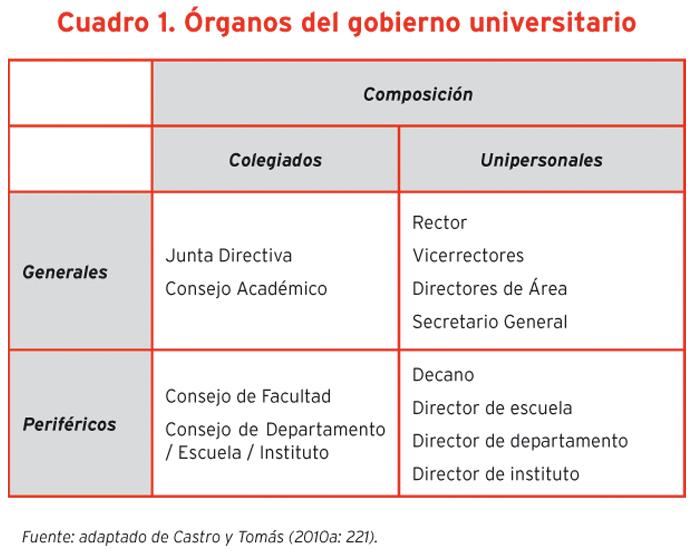 De acuerdo con Castro y Tomás (2010a), existen dos grandes criterios para clasificar a los órganos del gobierno universitario: según su composición se clasifican en unipersonales o colegiados, y según su ámbito de influencia, puedan ser generales o periféricos, como se muestra en el cuadro I.