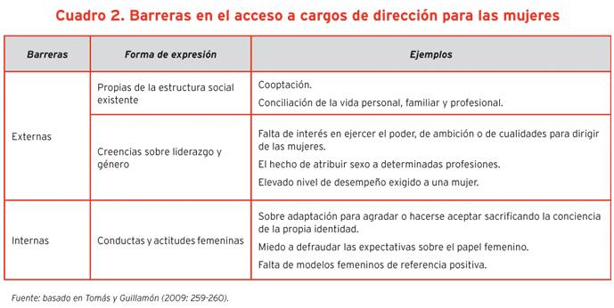 En el cuadro II, Tomás y Guillamón (2009) proponen diferentes clasificaciones y taxonomías existentes en la literatura, logrando configurar dos grandes tipos de barreras que provocarían el techo de cristal en las organizaciones: internas y externas. En lo relativo específicamente a las barreras de tipo interno, éstas serían resultado del proceso de socialización a través del cual se transmiten ciertos valores diferentes para niños y niñas dentro de la sociedad, lo que se traduciría en ciertos estereotipos o creencias de las propias mujeres sobre su acceso a los puestos de alta dirección.
