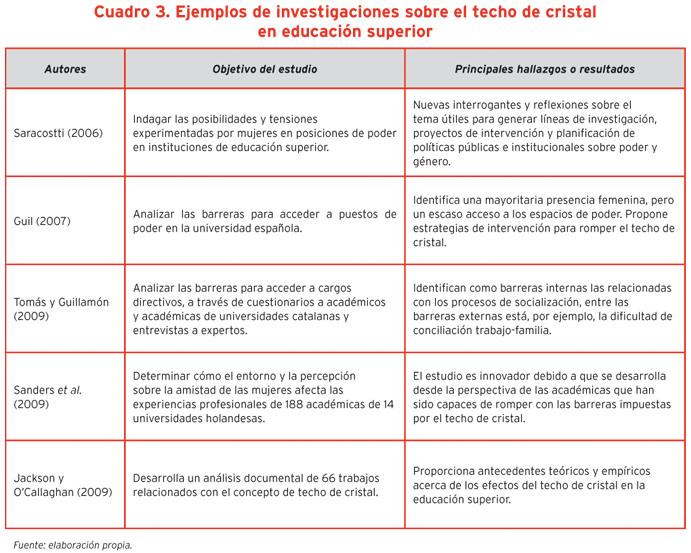 Actualmente, es posible observar en la literatura diversas investigaciones que analizan tanto la inserción de las mujeres en el mundo académico, específicamente respecto de su acceso a los puestos de alta dirección dentro de las universidades y la configuración del denominado techo de cristal, como se observa en el cuadro III.