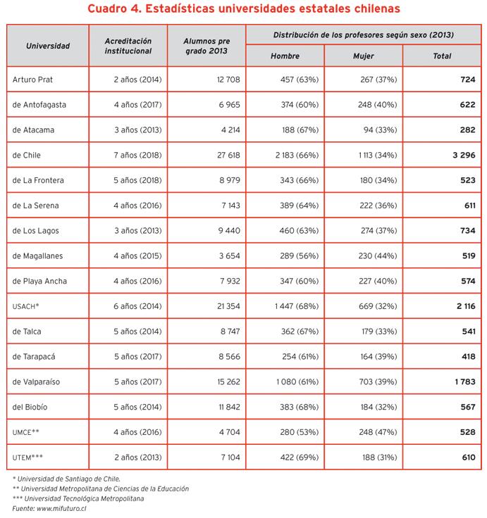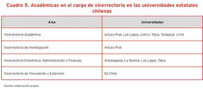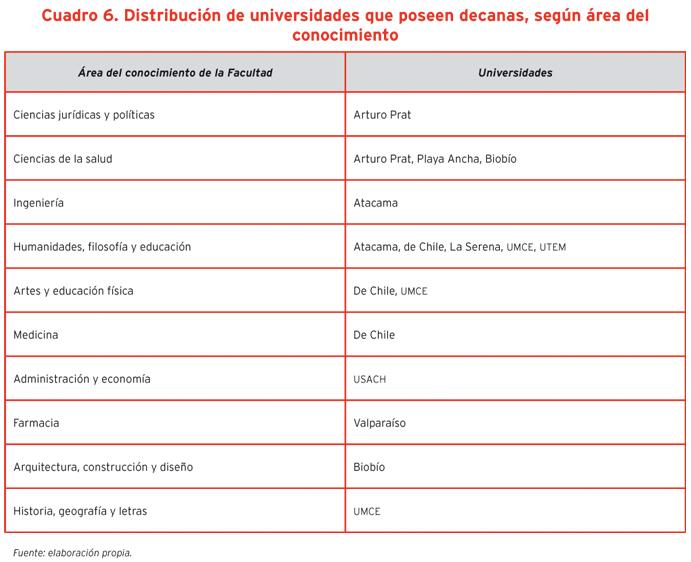 Sin embargo, cinco universidades de la muestra (Antofagasta, La Frontera, Magallanes, Talca y Tarapacá) no poseen ninguna decanatura desempeñada por una mujer, representando el 31% del total de universidades estatales chilenas.