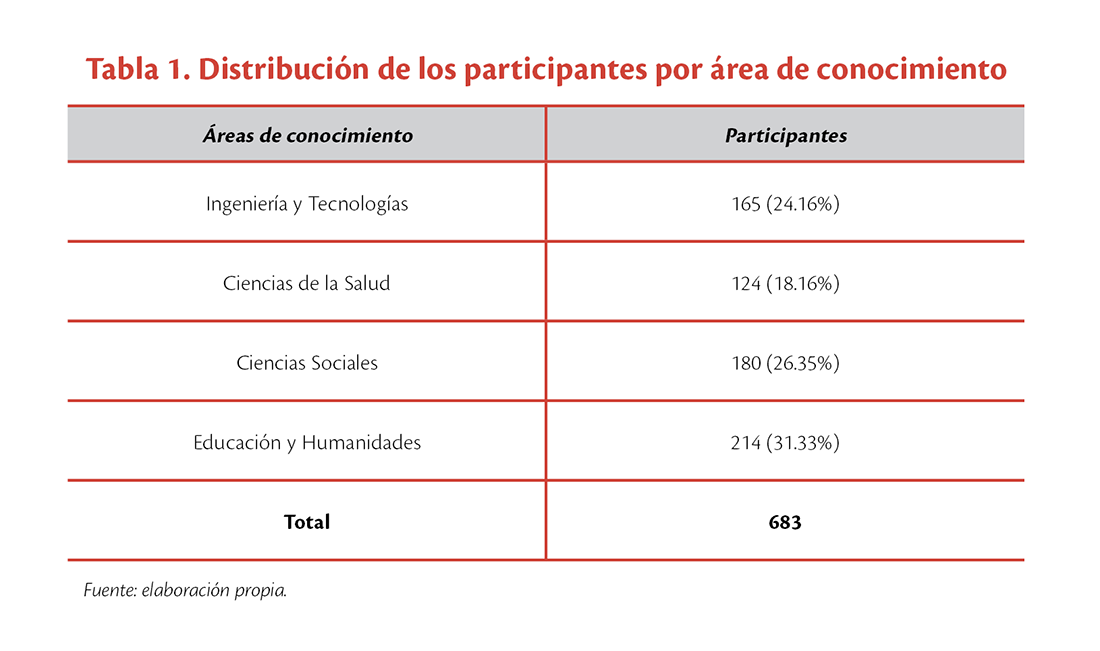 La población de estudio estuvo conformada por una muestra de 683 estudiantes pertenecientes a la etapa terminal de diversos programas educativos agrupados en cuatro áreas de conocimiento: Ingeniería y Tecnologías, Ciencias de la Salud, Ciencias Sociales y Educación y Humanidades (ver tabla 1). De los 683 participantes, el 53.15% (363) corresponde al sexo femenino y el 46.85% (320) al masculino.