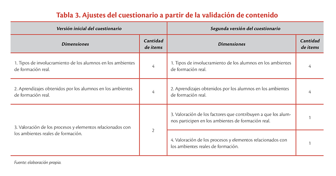 Con la intención de aportar calidad al instrumento y siguiendo las recomendaciones de McMillan y Schumacher (2005), se sometió a una validación de contenido con seis jueces especialistas en educación superior y curriculum, dicha validación fue de forma independiente, mediante un formulario electrónico que valoró cada ítem con los criterios de claridad, relevancia, congruencia y suficiencia, de acuerdo con la metodología de Escobar-Pérez y Cuervo-Martínez (2008). El resultado fue positivo pues todos los criterios superaron el 75% de coincidencia entre jueces, pero aun así de acuerdo con los comentarios emitidos por los especialistas, el instrumento se ajustó para mejorar la claridad de los ítems, además de una modificación en la estructura del cuestionario que implicó la separación en dos grupos de ítems que inicialmente se integraban en una misma dimensión denominada “Valoración de los procesos y elementos relacionados con los ambientes reales de formación”, lo que permitió una segunda dimensión que integró a los relacionados con la “valoración de los factores que contribuyen a que los alumnos participen en los ambientes de formación real”. La tabla 3 da cuenta del ajuste del cuestionario.