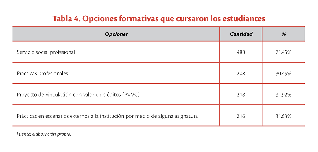 Con respecto a las opciones formativas que cursaron los estudiantes participantes en el estudio, el 71.45% (488) indicó Servicio Social Profesional; el 30.45%, (208) Prácticas Profesionales; el 31.92% (218), Proyectos de Vinculación con Valor en Créditos; y el 31.63% (216), Prácticas en escenarios externos por medio de alguna asignatura (ver tabla 4).