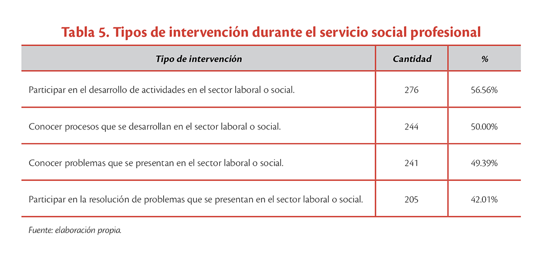 En cuanto al servicio social profesional, al 56.56% (276) de los estudiantes que cursaron esta opción formativa les permitió “participar en el desarrollo de actividades en el sector laboral o social”, mientras que la opción con el porcentaje más bajo fue la “participación en la resolución de problemas que se presentan en el sector laboral o social”, con el 42.01% (205). El resto de las opciones se ubicó alrededor del 50% (ver tabla 5).