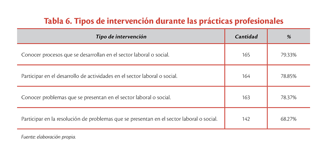 Con repecto a las prácticas profesionales, al 79.33% (165) le permitió “conocer procesos que se desarrollan en el sector laboral o social”; al 78.85% (164) le ayudó a “participar en el desarrollo de actividades en el sector laboral o social”; al 78.37% (163) le fue útil para “conocer problemas que se presentan en el sector laboral o social”; y, finalmente, al 68.27% (142) le permitió “participar en la resolución de problemas que se presentan en el sector laboral o social” (ver tabla 6).