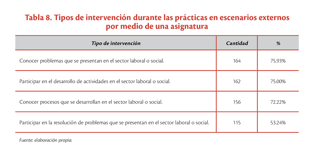 Finalmente, en cuanto a las prácticas en escenarios externos por medio de una asignatura, de los 216 que seleccionaron esta opción, al 75.93% (164) le permitió “conocer problemas que se presentan en el sector laboral o social”; al 75% (162) le dio la oportunidad de “participar en el desarrollo de actividades”; al 72.22% (156) lo ayudó a “conocer procesos que se desarrollan”; y, finalmente, el 53.24% (115) pudo “participar en la resolución de problemas en el sector laboral o social” (ver tabla 8).