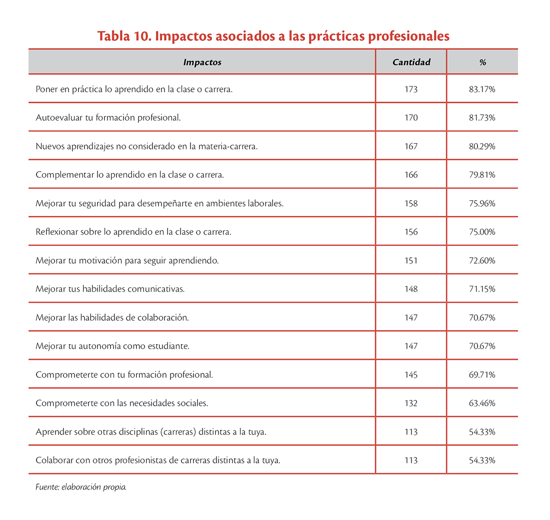 Con respecto a las prácticas profesionales, de los 208 estudiantes que eligieron esta opción formativa, al 83.71% (173) le permitió “poner en práctica lo aprendido en la clase o carrera”; el 81.73% (170) pudo “autoevaluar su formación profesional”; y el 80.29% (167) “adquirió nuevos aprendizajes no considerados en la materia-carrera”. Entre los impactos con los porcentajes más bajos se encuentran: 1) aprender sobre otras disciplinas (carreras) distintas a la suya y colaborar con otros profesionistas de carreras distintas a la de ellos con 54.33% (113) y 2) comprometerte con tu formación profesional con el 63.46% (132) (ver tabla 10).