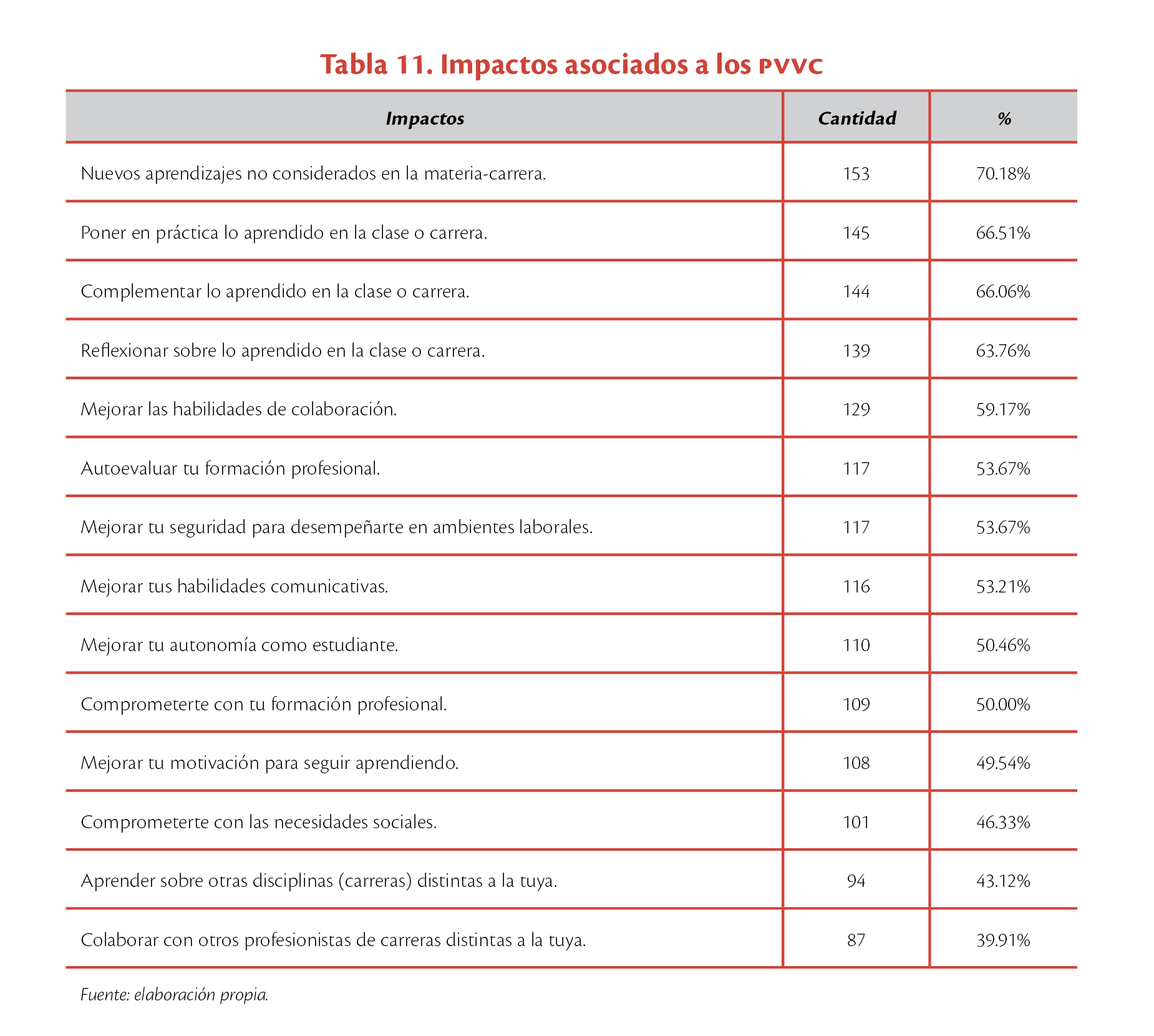 Sobre a los PVVC, 218 participantes seleccionaron dicha opción. De estos, el 70.18% (153) indicó que esta opción formativa les permitió “adquirir nuevos aprendizajes no considerados en la materia-carrera”; al 66.51% (145) le ayudó a “poner en práctica lo aprendido en la clase o carrera”, mientras que el 66.06% (144) considera que los apoyó para “complementar lo aprendido en la clase o carrera”. Los impactos con los porcentajes más bajos fueron: 1) aprender sobre otras disciplinas (carreras) distintas a la suya, con 43.12% (94) y 2) colaborar con otros profesionistas de carreras distintas a la de ellos, con 39.91% (87) (ver tabla 11).