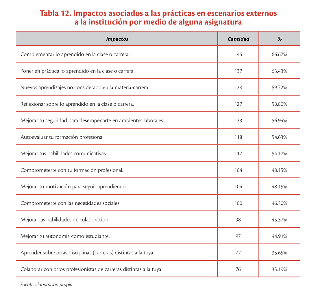 Finalmente, de acuerdo con los 216 participantes que seleccionaron la opción de las prácticas en escenarios externos a la institución por medio de alguna asignatura, el 66.67% (144) expresó que esta opción formativa les permitió “complementar lo aprendido en la clase o carrera”, mientras que el 63.43% (137) pudo “poner en práctica lo aprendido en la clase o carrera”. Por su parte, al 59.72% (129) le ayudó a “adquirir nuevos aprendizajes no considerados en la materia-carrera”. Entre los impactos con los porcentajes más bajos se encuentran: 1) colaborar con otros profesionistas de carreras distintas a la de ellos, con 35.19% (76) y 2) aprender sobre otras disciplinas (carreras) distintas a la suya, con 35.65% (77) (ver tabla 12).