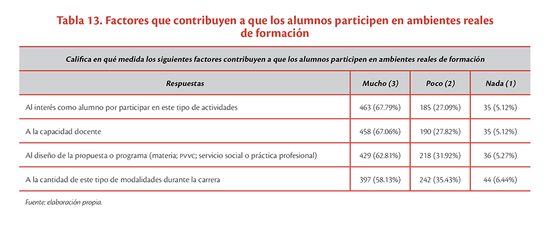 Además, los estudiantes opinaron que “el interés del alumno por participar en estas actividades”, “la capacidad del docente, el diseño de la propuesta o programa” y “la cantidad de este tipo de modalidades durante la carrera” contribuyen mucho para que los estudiantes se involucren en estas opciones formativas (ver tabla 13).