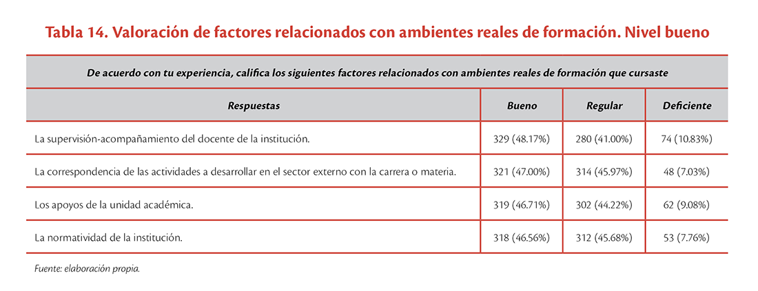 Para concluir con la encuesta, se les pidió calificar en una escala de bueno, regular y deficiente, una serie de factores (ver tabla 14). Es importante mencionar que ninguno de estos tiene un mayor porcentaje en el nivel de deficiente (no superan el 18%), por lo que solo se mencionarán los que se encuentran en el nivel bueno y regular. Los tres factores evaluados con el puntaje más alto en el nivel de bueno son: 1) la supervisión-acompañamiento del docente, con 48.17% (329); 2) la correspondencia de las actividades a desarrollar en el sector externo con la carrera o materia, con 47% (321); y 3) los apoyos de la unidad académica, con 46.71% (319).