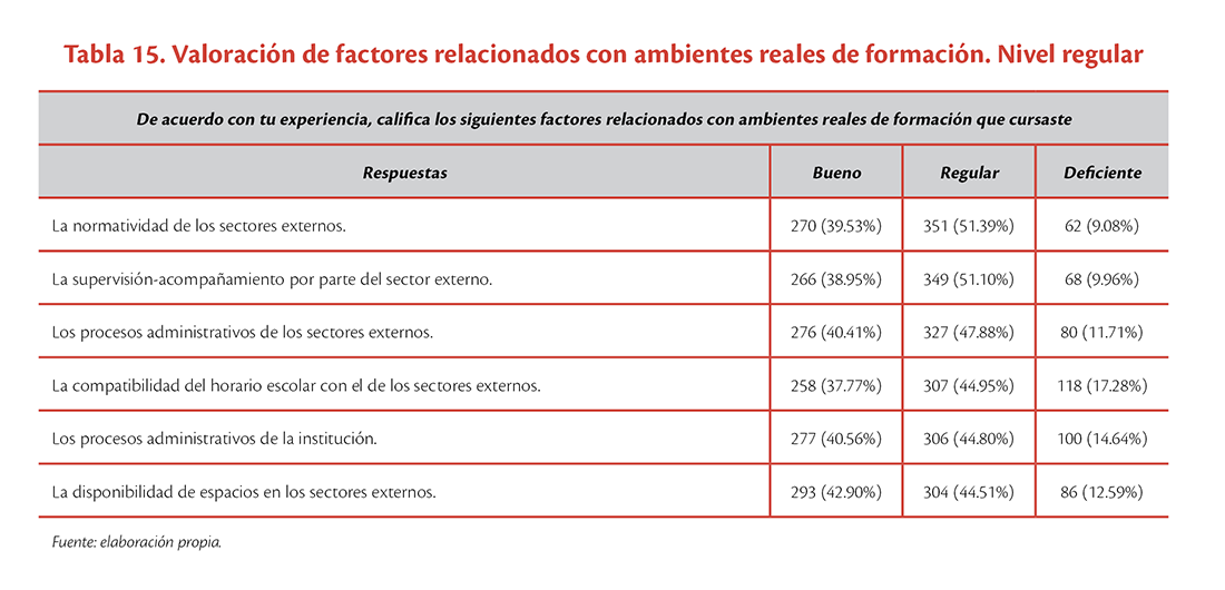 Por su parte, los tres factores evaluados con el puntaje más alto en el nivel de regular se encuentran: 1) la normatividad de los sectores externos, con 51.39%(351); 2) la supervisión-acompañamiento por parte del sector externo, con 51.10% (349); y 3) los procesos administrativos de los sectores externos, con 47.88% (327) (ver tabla 15).
