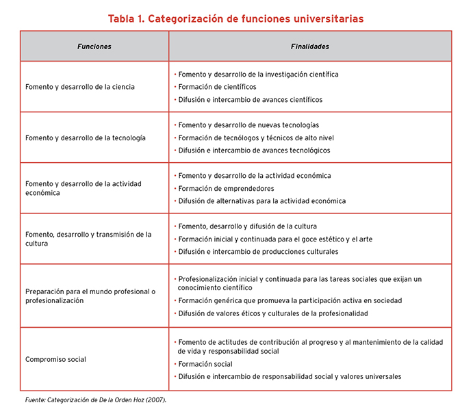 Se aplicaron dos instrumentos a las tres poblaciones durante el periodo de septiembre de 2009 a mayo de 2010. Uno, el cuestionario de De la Orden Hoz (2007), que contiene las funciones universitarias clasificadas en seis aspectos (tabla 1) y se responde en una escala tipo likert donde el mínimo de cumplimiento de cada función es representado con el número 1 y el máximo con el número 7.