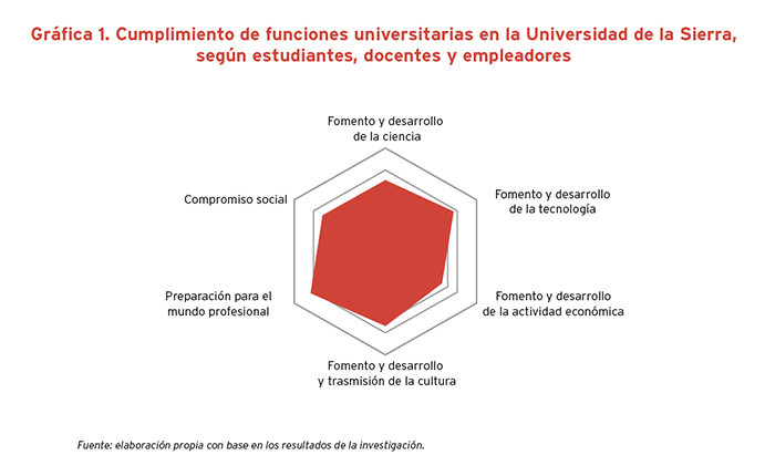 De la valoración que tienen los tres actores sobre el desempeño de varias funciones por parte de la Universidad de la Sierra, se concluye que existen varias coincidencias entre docentes y empleadores: consideran que el compromiso social, el fomento y desarrollo de la actividad económica, y el fomento y desarrollo de la ciencia son las funciones menos valoradas y realizadas en la institución; los docentes, además, consideran que en la IES donde laboran está descuidada la función de fomento al desarrollo de la tecnología. La preparación para el mundo profesional ha sido considerada como una función que esta IES cumple de manera adecuada, por parte de estudiantes y empresarios, a diferencia de los docentes que califican esta función como medianamente lograda en la institución.