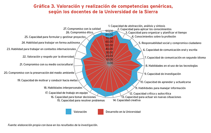 En la parte final del instrumento que se aplicó a estos tres actores, se les pidió que señalaran cinco de las 27 competencias genéricas descritas en el proyecto Alfa Tuning para América Latina que, según su perspectiva, tienen más valor y además deberían haber adquirido los estudiantes de la Universidad de la Sierra al egresar de dicha institución educativa. Tales resultados se describen a continuación.