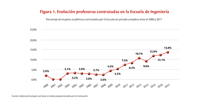 La existencia de una mayor cantidad de mujeres en el cuerpo académico de la Escuela de Ingeniería es una situación novedosa dentro de la institución. Desde 2008 se ha producido un crecimiento en el número de académicas de jornada completa, lo que las ha llevado a marcar mayor presencia institucional. Este aumento se asocia a un incremento en el nivel de competencia para el ejercicio de la academia, destacando la posibilidad de seguir estudios de doctorado como un elemento esencial.