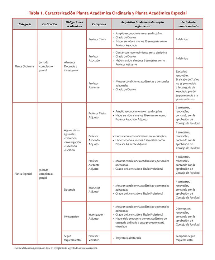 Su reglamento de carrera académica divide a los profesores en dos grandes categorías: Planta Ordinaria y Planta Especial, de acuerdo con el criterio del mérito académico y el tipo de actividades realizadas. Mientras los profesores de planta ordinaria se asocian a un mayor nivel de dedicación a la universidad, desarrollando como mínimo tareas de docencia e investigación, los de planta especial son contratados específicamente para alguna de las siguientes actividades: docencia, investigación, extensión o gestión. La tabla 1 resume las principales características de ambas categorías.