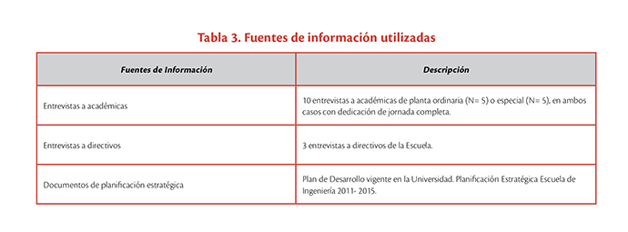 El presente estudio de caso se enmarca dentro de la metodología cualitativa que se adapta a los objetivos de este estudio y a su carácter exploratorio, al buscar describir y comprender la particularidad del fenómeno dentro de su propio contexto (Merriam, 2001; Yin, 2003). La investigación fue realizada con base en un análisis temático (Braun y Clarke, 2012) de entrevistas semiestructuradas realizadas a académicas y directivos de la Escuela, lo que se complementó con la revisión de documentos de planificación estratégica de la institución (tabla 3).