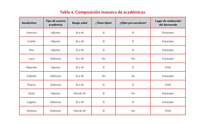 En cuanto a las académicas, la muestra estuvo compuesta por 10 de las 24 contratadas en jornada completa en la Escuela. Las participantes de este estudio fueron académicas en las siguientes categorías: Instructor Adjunto (N=1), Profesor Asistente Adjunto (N=4), Profesor Asistente (N=4) y Profesor Asociado (N=1), lo que refleja la composición general del cuerpo académico, con una mayor proporción de mujeres en los niveles iniciales de la jerarquía. La tabla 4 resume los principales criterios de composición de la muestra de académicas.