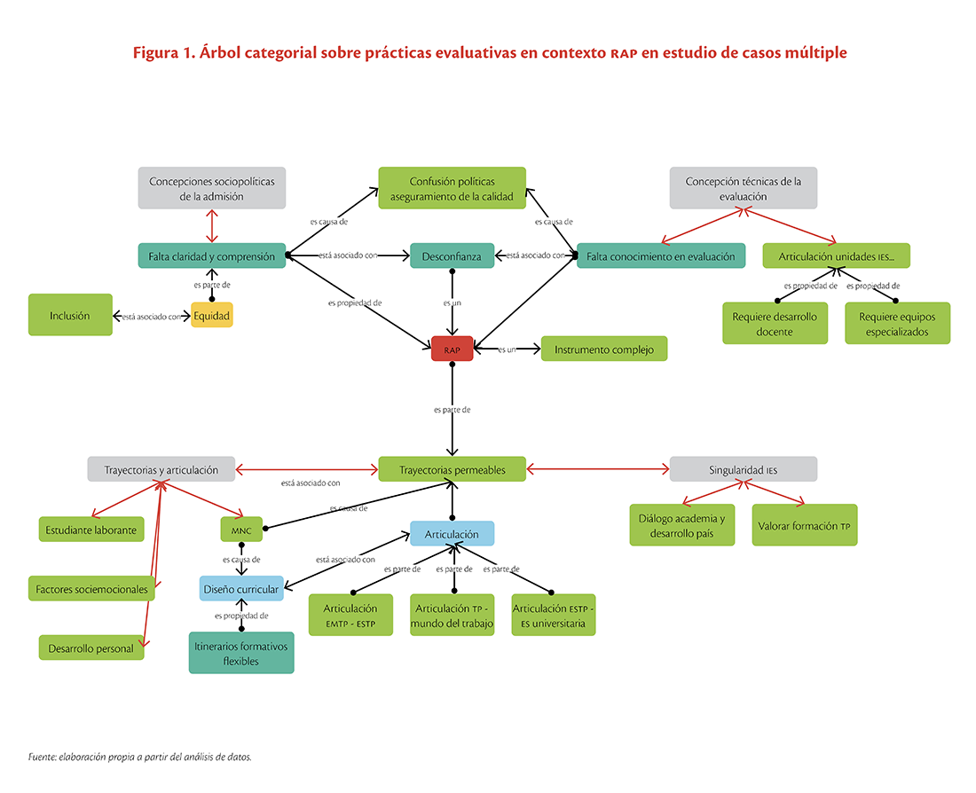 Resulta oportuno visualizar el árbol categorial que explica los elementos comunes sobre las prácticas evaluativas desde los casos de estudio. Como se observa en la figura 1, en el núcleo se ubica el RAP como objeto de estudio y en los cuatro vértices las dimensiones de cada objetivo específico. Éstas no se comprenden desde la separación de redes semánticas por cada eje, sino desde la interconexión y retroalimentación aportadas por cada una de ellas, respondiendo al objetivo general de la investigación y resguardando la coherencia interna del estudio.