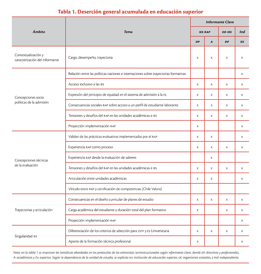 Se utilizaron dos tipos de instrumentos: entrevista semiestructurada y análisis de documentos de carácter normativo y declarativo. Específicamente, se utiliza la entrevista semiestructurada, atendiendo que permite acercarse al mundo de significados del informante, mediante la planificación de ámbitos de preguntas y temáticas (Redón y Angulo, 2017). Se elaboró un protocolo o guía de temas y preguntas, según cada tipo de informante, estableciendo los ámbitos en que versa el espacio de conversación (Vallejos y Angulo, 2017), tras lo cual, y con el fin de asegurar los criterios de calidad en la investigación, se validaron por juicio de experto los protocolos diseñados, tanto en lo concerniente a su coherencia interna como por la claridad de las preguntas, garantizando la confiabilidad, mediante la seguridad y/o auditabilidad de que los procedimientos efectuados fueron desarrollados de un modo pautado y no antojadizo (Vasilachis, 2006). En la selección de los expertos se consideró su conocimiento sobre el objeto de estudio, esto es: prácticas evaluativas en el marco del RAP, y su experiencia en formación técnica y profesional, considerando elementos de articulación y trayectorias formativas flexibles. Se procedió a realizar las mejoras expresadas y confirmar el guión definitivo de la entrevista.