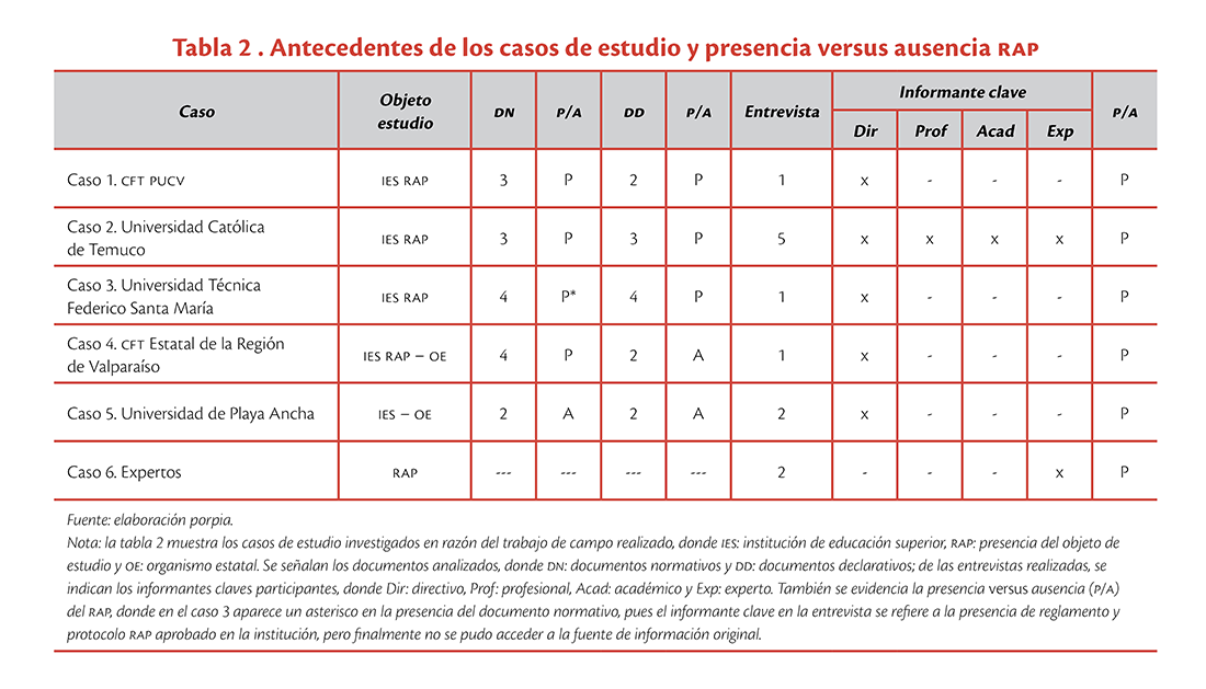 En torno a los seis casos de estudio, se lograron concretar tres unidades de estudio relativas a IES pertenecientes al Consejo de Rectores de Universidades Chilenas (CRUCH), dos unidades de estudio referidas a centros de formación técnica (CFT), una universidad de carácter público y el caso de dos expertos no adscritos directamente a ninguna unidad de estudio anterior. En la tabla 2 se evidencia la presencia o ausencia del RAP como práctica evaluativa en las fuentes de información recogidas.