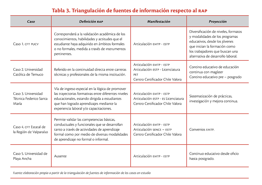 A continuación, en la tabla 3 se sistematiza la triangulación de fuentes de información respecto del RAP en su definición, en su manifestación y concreción dentro de cada institución, abordando la proyección en cada caso.