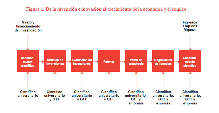 Para el caso de los países en desarrollo se destacan dos vínculos de este diagrama en particular. El primero es el que muestra cómo se relacionan las actividades científicas con la producción de riqueza y bienestar y la generación de empleos mediante la innovación. El segundo es el vínculo —aquí denominado oficina de transferencia de tecnología, OTT— entre la universidad y el sector productivo. La debilidad o ausencia de este vínculo es un fenómeno de la mayor importancia que preocupa tanto a países en vías de desarrollo como a países desarrollados. A decir verdad, no hay país en el mundo en el que la investigación científica y la innovación tecnológica se vinculen al proceso productivo de manera automática y decisiva, a menos que exista un agente o institución (OTT) responsable de establecer y promover dichos vínculos. La expresión institucional de esta unidad de transferencia depende, por una parte, de las políticas de estado y, por otra, de la forma de participación del sector empresarial del país en cuestión (Yusuf, 2007). En cualquier caso, la ausencia o fragilidad de tales instituciones es mayor en América Latina que en el mundo desarrollado.