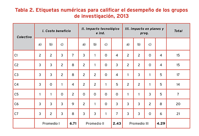 Para la distribución del presupuesto de investigación 2011–2013 del Departamento de Energía, de la UAM Azcapotzalco, sólo se aplicaron los criterios I a III de la sección anterior. La aplicación parcial fue un acuerdo para conciliar con la inercia de varios años, durante los cuales se hizo esta distribución mediante el acumulado de los puntajes arrojados por el Tabulador para Ingreso y Promoción del Personal Académico (TIPPA) de la institución (TIPPA, 2015: 19). A la evaluación cuantitativa con el TIPPA se le consideró en el criterio IV. En este Departamento existen siete colectivos de investigación que denotamos por C1-C7 y, con base en las siguientes tablas, se presentan los resultados de la evaluación cualitativa, efectuada por una comisión cuyos integrantes gozan de prestigio en el Departamento.