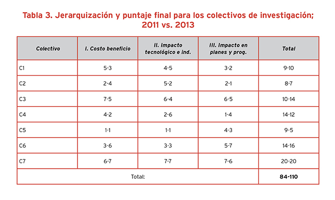 De las tablas anteriores se pueden extraer algunas conclusiones. Por brevedad, sólo consideramos tres colectivos. Los integrantes del colectivo C7, que es el mejor evaluado, en su mayoría no poseen la máxima habilitación académica ni pertenecen al SNI. No obstante, en el primer año este colectivo mostró un modelo de funcionamiento muy productivo, con líneas de investigación bien definidas, múltiples relaciones de trabajo con el sector productivo, instituciones del sector gubernamental, comunidades productoras y programas de gestión en la UAM.