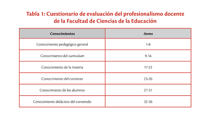 Para la recogida de información hemos utilizado un cuestionario construido ad hoc, de escala Likert (1 completamente en desacuerdo/nunca; 2 en desacuerdo/pocas veces; 3 de acuerdo/la mayoría de las veces; y 4 completamente de acuerdo/siempre, o casi siempre) validado por medio de un juicio de expertos, donde los alumnos valorarán, por un lado, la presencia o ausencia de una serie de afirmaciones correspondientes al conocimiento profesional docente, es decir, conocimiento pedagógico, didáctico, de la materia, de los alumnos, del contexto y del curriculum, que ellos han observado a lo largo del transcurso de su titulación y, por otro lado, el grado de importancia que ellos conceden a la puesta en práctica de dicho conocimiento en el desempeño de la actividad profesional docente. La validación del cuestionario se realizó siguiendo las siguientes pautas.